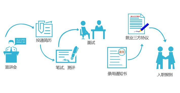 社會招聘流程:校園招聘流程: 如候選人在外地,不方便前來公司參加面試,公司可根據實際情況與候選人預約安排電話或視頻面試,并邀約通過初試的候選人前來公司參加終面。 *特定崗位及招錄的應屆生儲備干部會根據實際需求進行在線綜合測評。